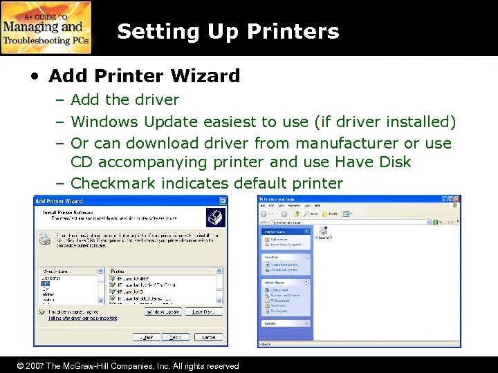 Setting Up Printers • Add Printer Wizard – Add the driver – Windows Update easiest to use (if driver installed) – Or can download driver from manufacturer or use CD accompanying printer and use Have Disk – Checkmark indicates default printer © 2007 The Mc. Graw-Hill Companies, Inc. All rights reserved