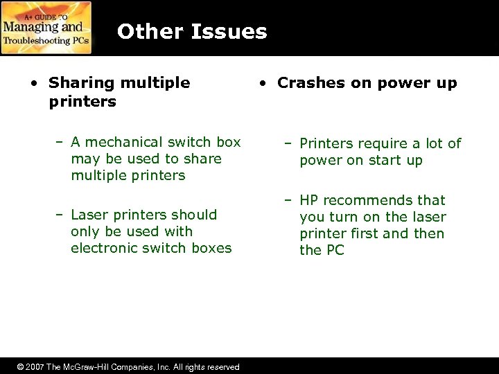 Other Issues • Sharing multiple printers • Crashes on power up – A mechanical switch box may be used to share multiple printers – Printers require a lot of power on start up – Laser printers should only be used with electronic switch boxes – HP recommends that you turn on the laser printer first and then the PC © 2007 The Mc. Graw-Hill Companies, Inc. All rights reserved