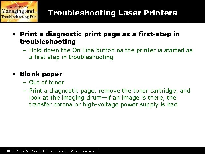 Troubleshooting Laser Printers • Print a diagnostic print page as a first-step in troubleshooting – Hold down the On Line button as the printer is started as a first step in troubleshooting • Blank paper – Out of toner – Print a diagnostic page, remove the toner cartridge, and look at the imaging drum—if an image is there, the transfer corona or high-voltage power supply is bad © 2007 The Mc. Graw-Hill Companies, Inc. All rights reserved