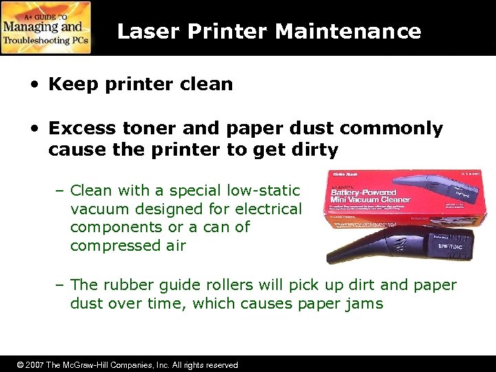 Laser Printer Maintenance • Keep printer clean • Excess toner and paper dust commonly cause the printer to get dirty – Clean with a special low-static vacuum designed for electrical components or a can of compressed air – The rubber guide rollers will pick up dirt and paper dust over time, which causes paper jams © 2007 The Mc. Graw-Hill Companies, Inc. All rights reserved