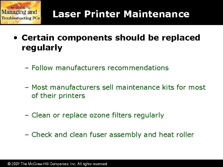 Laser Printer Maintenance • Certain components should be replaced regularly – Follow manufacturers recommendations – Most manufacturers sell maintenance kits for most of their printers – Clean or replace ozone filters regularly – Check and clean fuser assembly and heat roller © 2007 The Mc. Graw-Hill Companies, Inc. All rights reserved