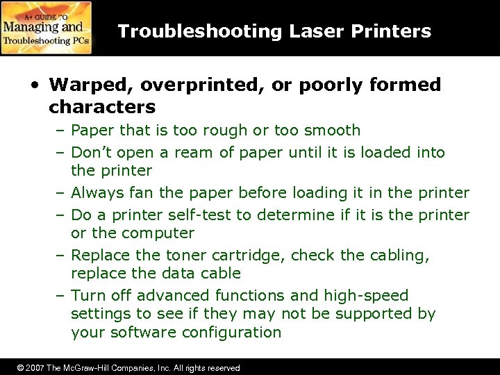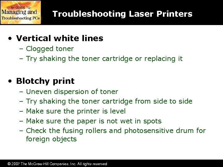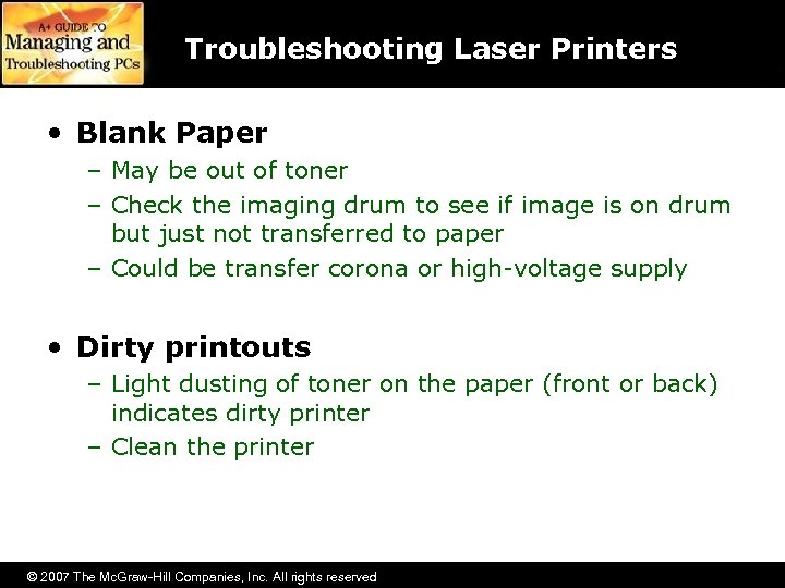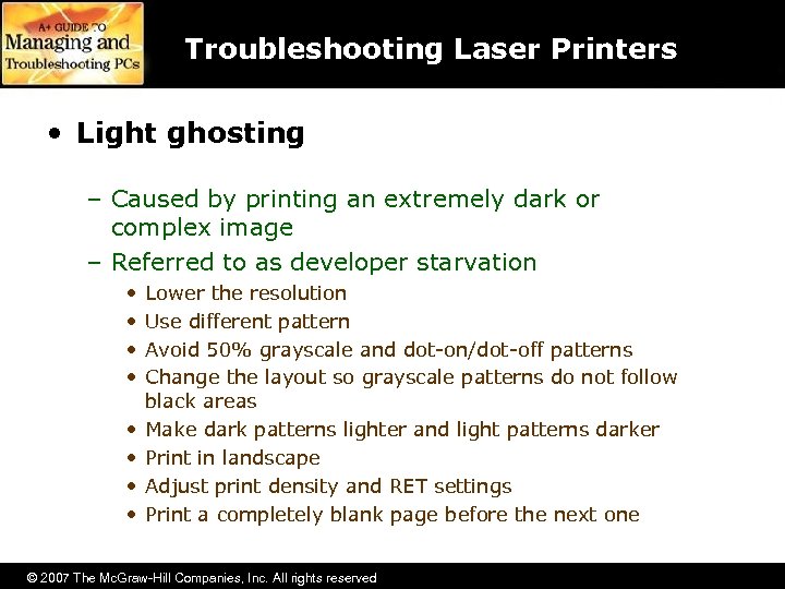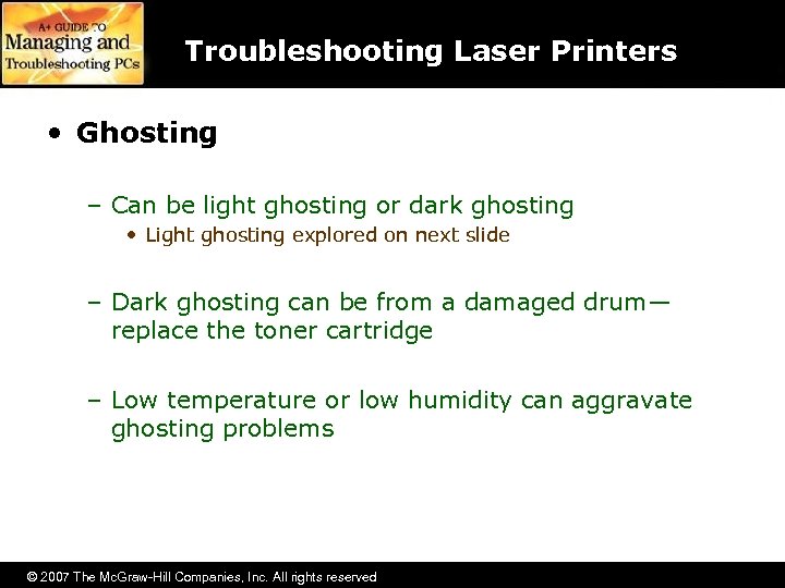 Troubleshooting Laser Printers • Ghosting – Can be light ghosting or dark ghosting • Light ghosting explored on next slide – Dark ghosting can be from a damaged drum— replace the toner cartridge – Low temperature or low humidity can aggravate ghosting problems © 2007 The Mc. Graw-Hill Companies, Inc. All rights reserved