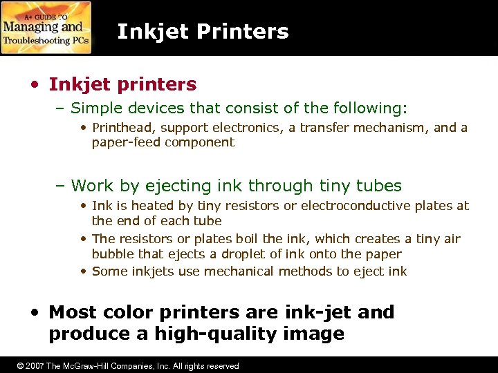 Inkjet Printers • Inkjet printers – Simple devices that consist of the following: • Printhead, support electronics, a transfer mechanism, and a paper-feed component – Work by ejecting ink through tiny tubes • Ink is heated by tiny resistors or electroconductive plates at the end of each tube • The resistors or plates boil the ink, which creates a tiny air bubble that ejects a droplet of ink onto the paper • Some inkjets use mechanical methods to eject ink • Most color printers are ink-jet and produce a high-quality image © 2007 The Mc. Graw-Hill Companies, Inc. All rights reserved