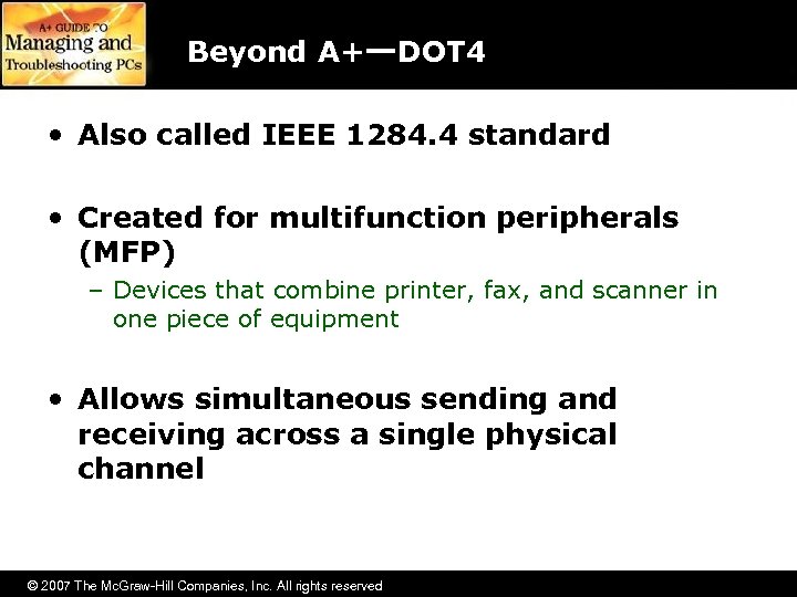 Beyond A+—DOT 4 • Also called IEEE 1284. 4 standard • Created for multifunction peripherals (MFP) – Devices that combine printer, fax, and scanner in one piece of equipment • Allows simultaneous sending and receiving across a single physical channel © 2007 The Mc. Graw-Hill Companies, Inc. All rights reserved