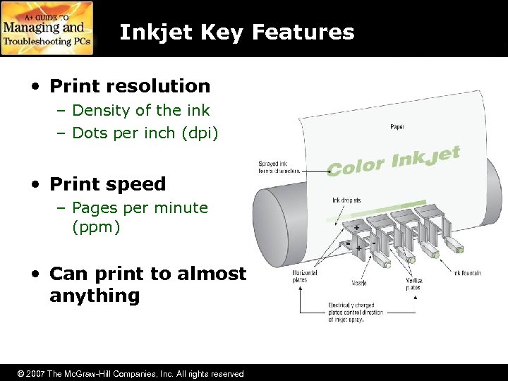 Inkjet Key Features • Print resolution – Density of the ink – Dots per inch (dpi) • Print speed – Pages per minute (ppm) • Can print to almost anything © 2007 The Mc. Graw-Hill Companies, Inc. All rights reserved