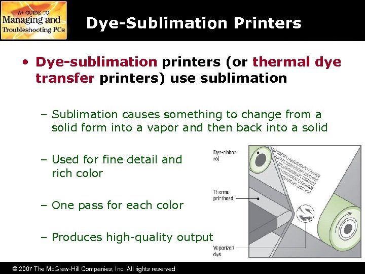 Dye-Sublimation Printers • Dye-sublimation printers (or thermal dye transfer printers) use sublimation – Sublimation causes something to change from a solid form into a vapor and then back into a solid – Used for fine detail and rich color – One pass for each color – Produces high-quality output © 2007 The Mc. Graw-Hill Companies, Inc. All rights reserved