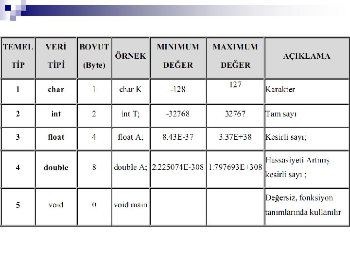 örnek #include<stdio. h> #include<conio. h> void main() { clrscr(); char a; float e; int b; long float f; unsigned int c; double g; long int d; a=10; e=12. 2; b=270; f=12. 333; c=50000; g=233. 1111111; d=200000; printf("a'nin değeri=%dn", a); printf("b'nin değeri=%in", b); printf("c'nin değeri=%un", c); printf("d'nin değeri=%ldnn", d); printf("e'nin değeri=%fn", e); printf("f'nin değeri=%lfn", f); printf("g'nin değeri=%lfn", g); }