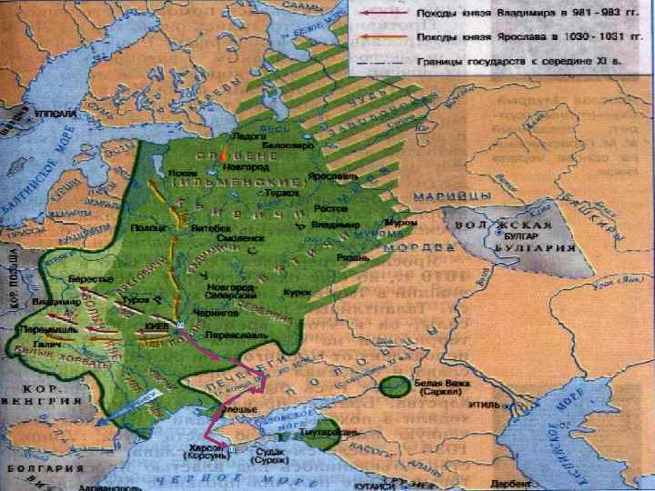 Древняя Русь: до и после крещения Имелось до 988 г. Появилось после 988 г Зачатки письменности, домашнее обучение, устная передача опыта Распространилась кириллица, возникло летописание, появились монастырские и княжеские школы Фольклор, языческие песни и танцы, сооружения из дерева -дома, крепости, мосты Началось каменное храмовое строительство, появилась мозаика фресковая живопись, церковное песнопение Развиты дерево- и металлообработка, гончарное, кожевенное, ювелирное производство Число ремесел выросло до 60. Началась чеканка собственной монеты Многоженство, умыкание невест, относительная свобода женщин Моногамия, церковный брак, подчинение женщины мужчине, повышение ответственности мужчины за семью и воспитание детей Преобладало обычное право При составлении «Русской Правды» важным источником стало каноническое (церковное) право У князей — расширение территории и укрепление своей власти Определение места Руси в мировом историческом процессе, идея сильной княжеской власти, сильного и единого государства
