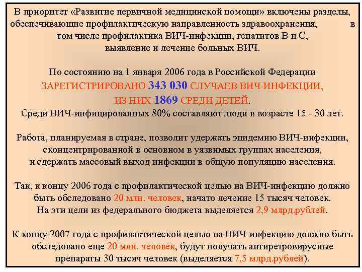 В приоритет «Развитие первичной медицинской помощи» включены разделы, обеспечивающие профилактическую направленность здравоохранения, в том числе профилактика ВИЧ-инфекции, гепатитов В и С, выявление и лечение больных ВИЧ. По состоянию на 1 января 2006 года в Российской Федерации ЗАРЕГИСТРИРОВАНО 343 030 СЛУЧАЕВ ВИЧ-ИНФЕКЦИИ, ИЗ НИХ 1869 СРЕДИ ДЕТЕЙ. Среди ВИЧ-инфицированных 80% составляют люди в возрасте 15 - 30 лет. Работа, планируемая в стране, позволит удержать эпидемию ВИЧ-инфекции, сконцентрированной в основном в уязвимых группах населения, и сдержать массовый выход инфекции в общую популяцию населения. Так, к концу 2006 года с профилактической целью на ВИЧ-инфекцию должно быть обследовано 20 млн. человек, начато лечение 15 тысяч человек. На эти цели из федерального бюджета выделяется 2, 9 млрд. рублей. К концу 2007 года с профилактической целью на ВИЧ-инфекцию должно быть обследовано еще 20 млн. человек, будут получать антиретровирусные препараты 30 тысяч человек (выделяется 7, 5 млрд. рублей).