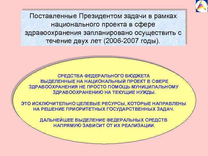 Поставленные Президентом задачи в рамках национального проекта в сфере здравоохранения запланировано осуществить с течение двух лет (2006 -2007 годы). СРЕДСТВА ФЕДЕРАЛЬНОГО БЮДЖЕТА ВЫДЕЛЕННЫЕ НА НАЦИОНАЛЬНЫЙ ПРОЕКТ В СФЕРЕ ЗДРАВООХРАНЕНИЯ НЕ ПРОСТО ПОМОЩЬ МУНИЦИПАЛЬНОМУ ЗДРАВООХРАНЕНИЮ НА ТЕКУЩИЕ НУЖДЫ. ЭТО ИСКЛЮЧИТЕЛЬНО ЦЕЛЕВЫЕ РЕСУРСЫ, КОТОРЫЕ НАПРАВЛЕНЫ НА РЕШЕНИЕ ПРИОРИТЕТНЫХ ГОСУДАРСТВЕННЫХ ЗАДАЧ. ДАЛЬНЕЙШЕЕ ВЫДЕЛЕНИЕ ФЕДЕРАЛЬНЫХ СРЕДСТВ НАПРЯМУЮ ЗАВИСИТ ОТ ИХ РЕАЛИЗАЦИИ.
