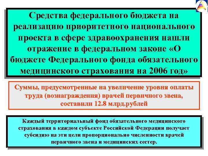 Средства федерального бюджета на реализацию приоритетного национального проекта в сфере здравоохранения нашли отражение в федеральном законе «О бюджете Федерального фонда обязательного медицинского страхования на 2006 год» Суммы, предусмотренные на увеличение уровня оплаты труда (вознаграждения) врачей первичного звена, составили 12. 8 млрд. рублей Каждый территориальный фонд обязательного медицинского страхования в каждом субъекте Российской Федерации получает субсидию на эти цели пропорционально численности врачей первичного звена и медицинских сестер.