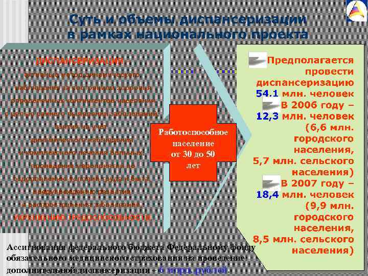 Работоспособное население от 30 до 50 лет Ассигнования федерального бюджета Федеральному фонду обязательного медицинского страхования на проведение дополнительной диспансеризации – 6 млрд. рублей.