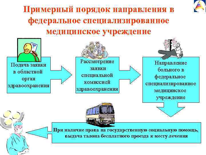 Примерный порядок направления в федеральное специализированное медицинское учреждение Подача заявки в областной орган здравоохранения Рассмотрение заявки специальной комиссией здравоохранения Направление больного в федеральное специализированное медицинское учреждение При наличие права на государственную социальную помощь, выдача талона бесплатного проезда к месту лечения
