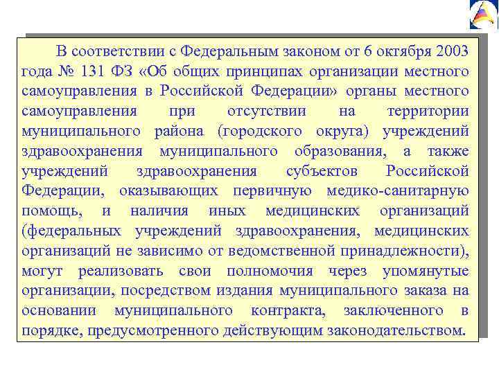 В соответствии с Федеральным законом от 6 октября 2003 года № 131 ФЗ «Об общих принципах организации местного самоуправления в Российской Федерации» органы местного самоуправления при отсутствии на территории муниципального района (городского округа) учреждений здравоохранения муниципального образования, а также учреждений здравоохранения субъектов Российской Федерации, оказывающих первичную медико-санитарную помощь, и наличия иных медицинских организаций (федеральных учреждений здравоохранения, медицинских организаций не зависимо от ведомственной принадлежности), могут реализовать свои полномочия через упомянутые организации, посредством издания муниципального заказа на основании муниципального контракта, заключенного в порядке, предусмотренного действующим законодательством.
