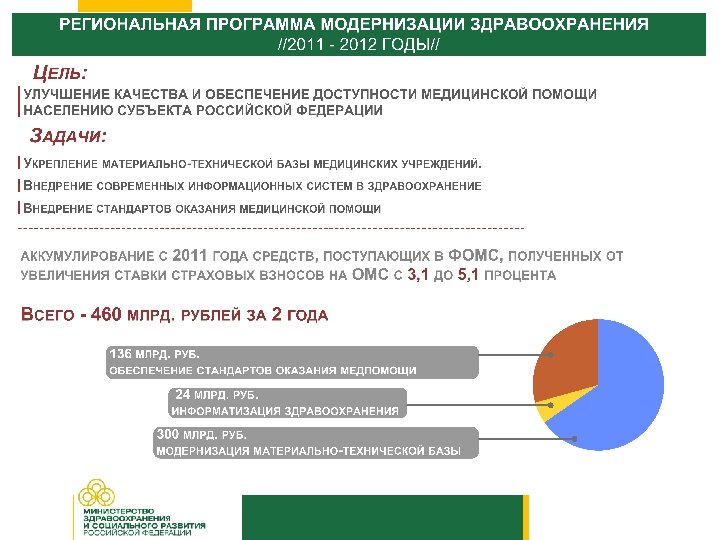 Кроме заработной платы, внедрение стандартов должно также коснуться и увеличения расходов на медикаменты и на расходные материалы. При этом, никто не собирается снимать с регионов финансировать медицинскую помощь через свои тарифы, мероприятия модернизации являются по сути «доплатой» к тарифам обязательного медицинского страхования. Из доклада Министра Татьяны Голиковой на Всероссийском форуме медицинских работников 13 апреля 2011