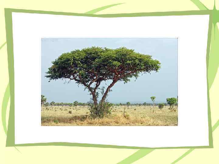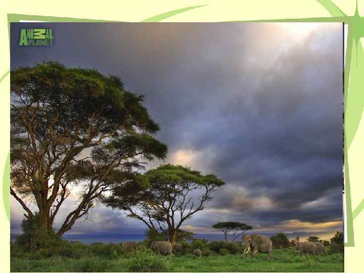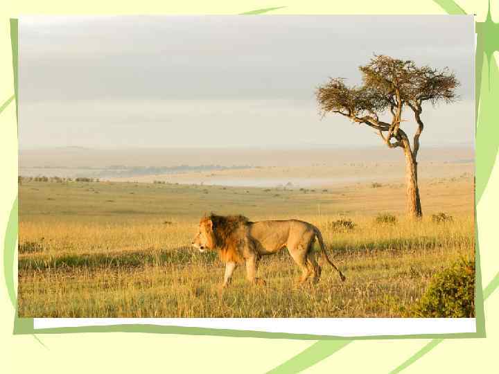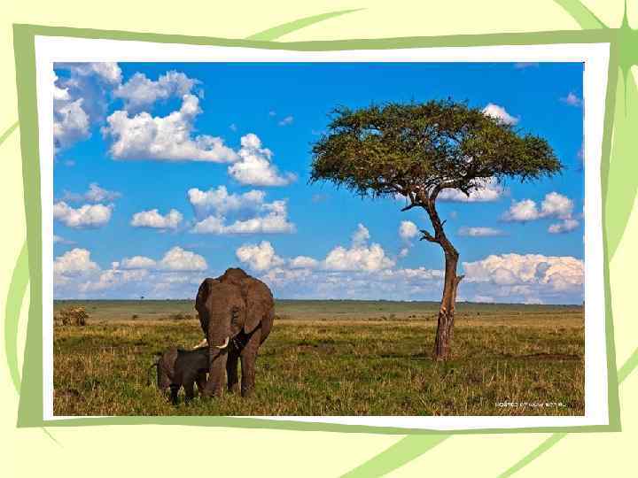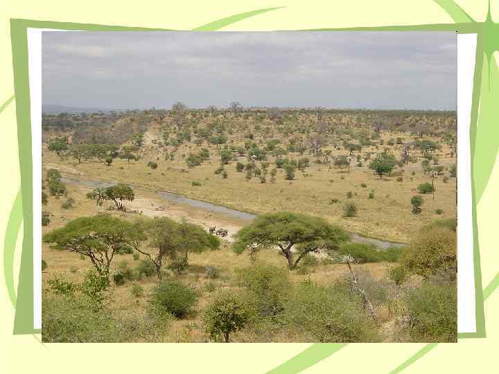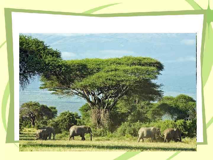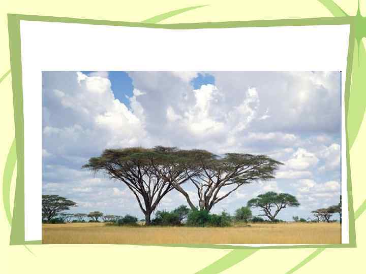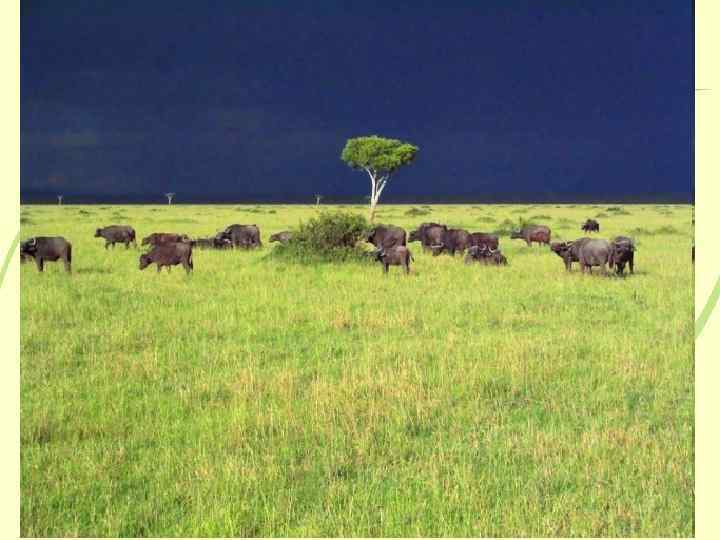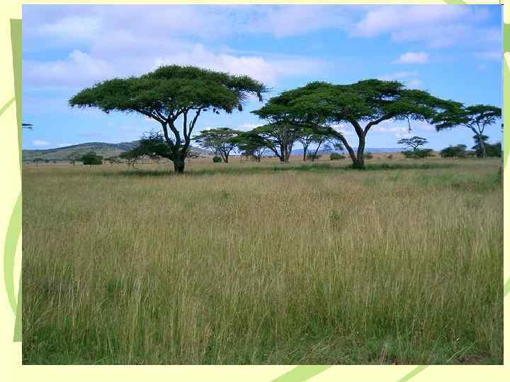 Саванны – травяные степи • Ярко выражена сезонность природы, смена окраски с зеленого цвета на желтый. • Много крупных травоядных животных и птиц, в водоемах водятся крокодилы.