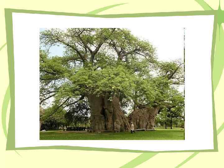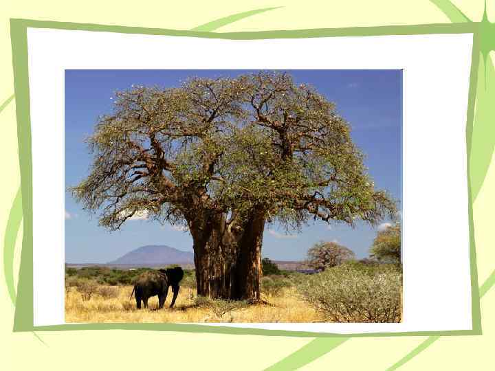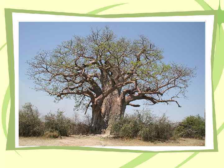 Баобаб – страж африканской саванны Баобаб - одно из самых толстых Баобаб деревьев в мире — при средней окружности ствола 9— 10 м, его высота всего 18 -25 м. Наверху ствол разделяется на толстые, почти горизонтальные ветви, образующие большую, до 38 м в диаметре, крону. Стволы содержат до 120 л воды. Древесина не горит. Врагами являются слоны. В сухой период, зимой, когда баобаб сбрасывает листву, он приобретает курьёзный вид дерева, растущего корнями вверх.