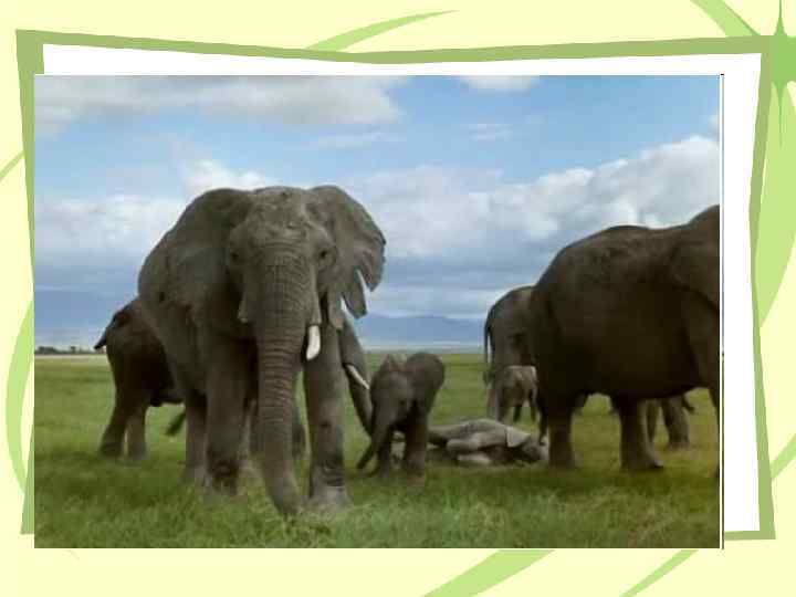 Слон – самый крупный обитатель суши Слоны могут достигать 2, 7 м в высоту и весить от 3 до 5 тонн. Новорожденные слонята рождаются около 0, 9 м высотой и весят 90 кг. У слона самые большие уши из всех живых существ на Земле. Слон очень хорошо плавает, даже на глубине. Обычно передвигается со скоростью 26 км/ч, могут развивать скорость до 35 -40 км/ч. • Спят слоны стоя, собравшись вместе в плотную группу; только детёныши ложатся на бок на землю.