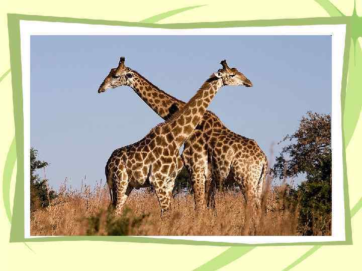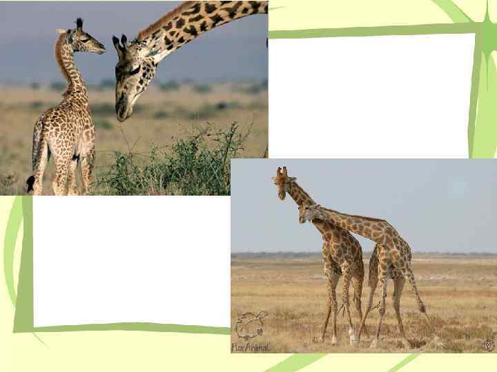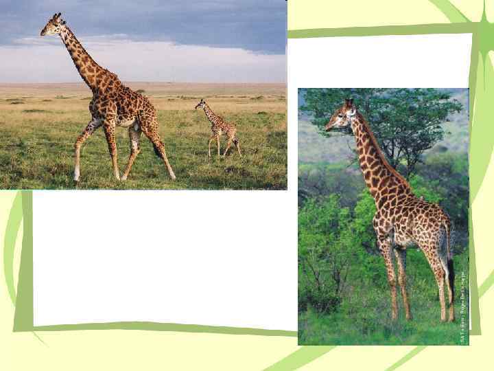Жираф – самое высокое в мире животное Самцы жирафа достигают высоты до 5, 5 м и весят до 900 кг. Самки, как правило, немного меньше и легче. Шея у жирафов необычайно длинная, и это несмотря на то, что у них, как и у почти всех других млекопитающих, лишь семь шейных позвонков. Высокий рост увеличивает нагрузку на систему кровообращения, особенно в отношении снабжения мозга, поэтому сердце у жирафов особенно сильное.