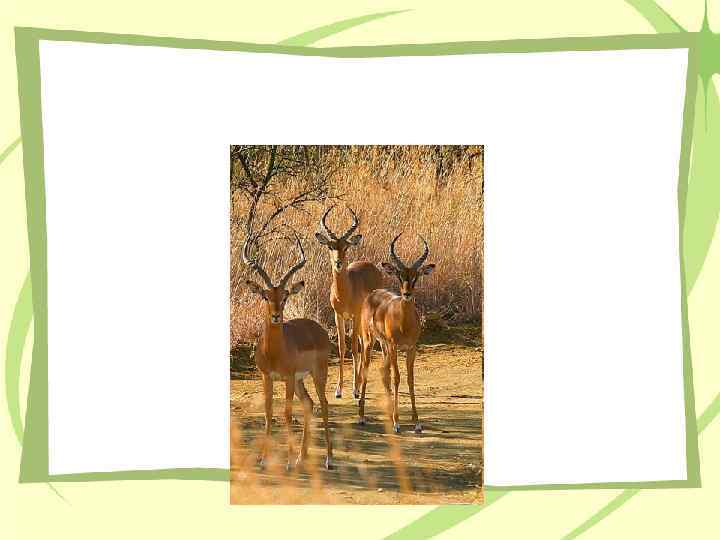• Голубые гну, зебры и газели составляют основное ядро травоядных животных. К ним присоединяются, порой в большом числе, рыжие, похожие на газелей импалы, громадные тяжеловесные канны, внешне нескладные, но исключительно быстроногие конгони, с узкой длинной мордой и круто загнутыми S-образными рогами. Местами встречается много серовато-бурых длиннорогих водяных козлов, родственников конгони, — топи, которых можно узнать по фиолетово-черным пятнам на плечах и ляжках, болотных козлов — некрупных стройных антилоп с красивыми лировидными рогами. К редким антилопам, которых даже в заповедниках можно встретить лишь случайно, относятся ориксы, длинные прямые рога которых напоминают шпагу, могучие лошадиные антилопы и обитатели кустарниковой саванны — куду. Закрученные в пологую спираль рога куду по праву считаются красивейшими.