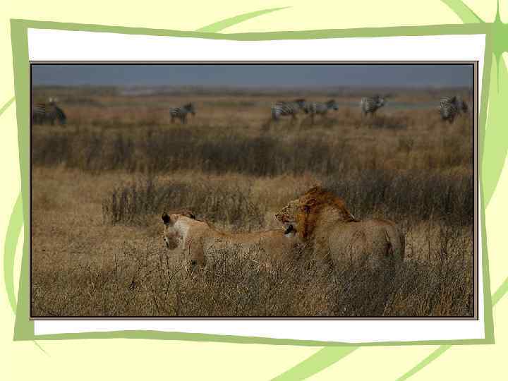 • В африканских саваннах много хищников. Среди них первое место, несомненно, принадлежит льву. Львы живут обычно группами — прайдами, в состав которых входят как взрослые самцы и самки, так и подрастающая молодежь. Обязанности между членами прайда распределены очень четко: более легкие и подвижные львицы обеспечивают прайд пищей, а на долю крупных и сильных самцов приходится охрана территории. Добычу львов составляют зебры, гну, конгони, но при случае львы охотно едят и более мелких животных и даже падаль.