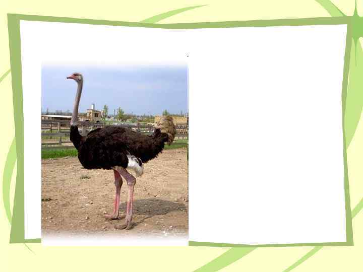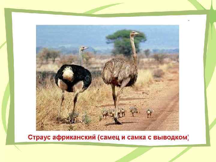 Африканский страус – самая крупная птица на Земле Бескилевая нелетающая птица. Название в переводе означает «Воробей – верблюд» . Рост достигает 270 см, масса до 175 кг. Глаза большие — самые крупные среди наземных животных, с густыми ресницами на верхнем веке.