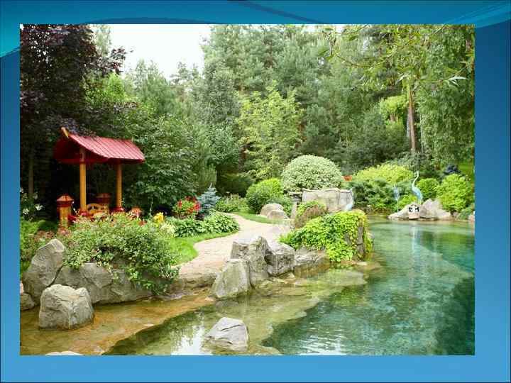 НАПРАВЛЕНИЯ: Английской школе ландшафтной архитектуры присуще художественное и функциональное единство природной среды и архитектурных сооружений. Французская школа основывается на рациональном, математически выверенном подходе, когда композиция парков имеет жесткий каркас и выглядит как огромный сочиненный орнамент зеленого ковра Школа ландшафтной архитектуры стран Востока. Главное – глубочайшее филосовскопоэтическое осознание роли природы в жизни человека.