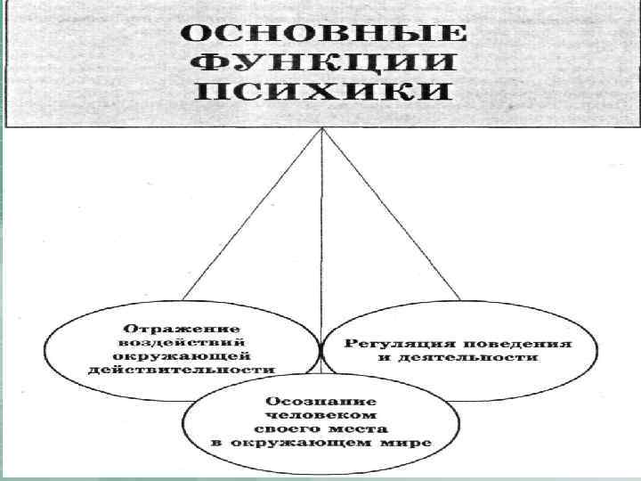 Основными функциями психики являются тесно взаимосвязанные между собой: 1. отражение объективной реальности и 2. регуляция индивидуального поведения и деятельности.