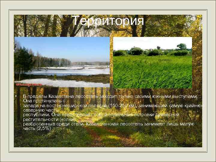Территория • В пределы Казахстана лесостепь заходит только своими южными выступами. Она протянулась с запада на восток неширокой полосой (150 -250 км), занимающей самую крайнюю северную часть республики. Она представляет собой отдельные островки древесной растительности (колки), разбросанные среди степи. Казахстанская лесостепь занимает лишь малую часть (2, 5%)