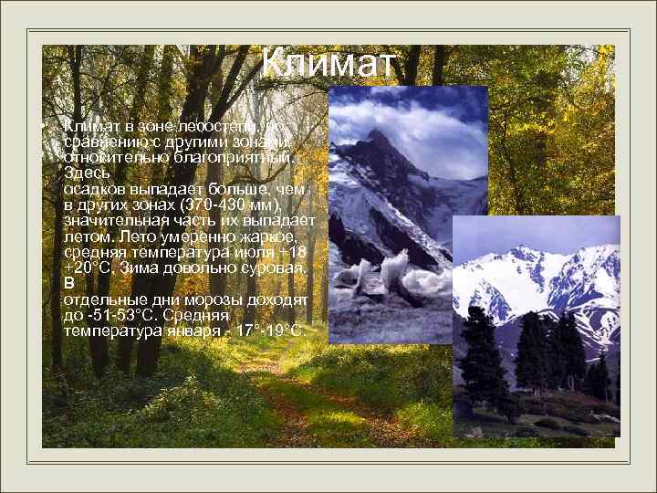Климат • Климат в зоне лесостепи, по сравнению с другими зонами, относительно благоприятный. Здесь осадков выпадает больше, чем в других зонах (370 -430 мм), значительная часть их выпадает летом. Лето умеренно жаркое, средняя температура июля +18 +20°С. Зима довольно суровая. В отдельные дни морозы доходят до -51 -53°С. Средняя температура января - 17°-19°С.