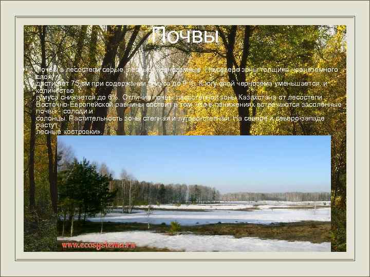 Почвы • Почвы в лесостепи серые, лесные, черноземные. На севере зоны толщина черноземного слоя достигает 75 см при содержании гумуса до 9 %. К югу слой чернозема уменьшается, и количество гумуса снижается до 6%. Отличие почвы лесостепной зоны Казахстана от лесостепи Восточно-Европейской равнины состоит в том, что в понижениях встречаются засоленные почвы - солоди и солонцы. Растительность зоны степная и лугово-степная. На севере и северо-западе растут лесные «островки» .