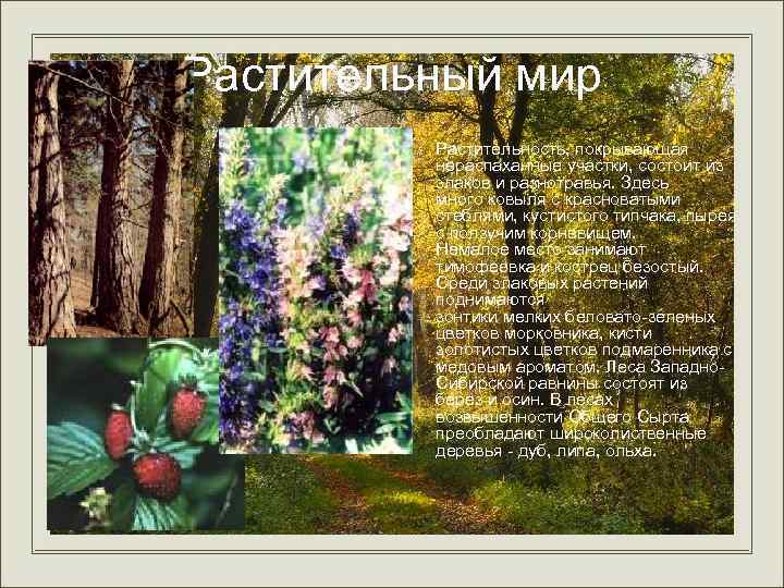 Растительный мир • Растительность, покрывающая нераспаханные участки, состоит из злаков и разнотравья. Здесь много ковыля с красноватыми стеблями, кустистого типчака, пырея с ползучим корневищем. Немалое место занимают тимофеевка и кострец безостый. Среди злаковых растений поднимаются зонтики мелких беловато-зеленых цветков морковника, кисти золотистых цветков подмаренника с медовым ароматом. Леса Западно. Сибирской равнины состоят из берез и осин. В лесах возвышенности Общего Сырта преобладают широколиственные деревья - дуб, липа, ольха.
