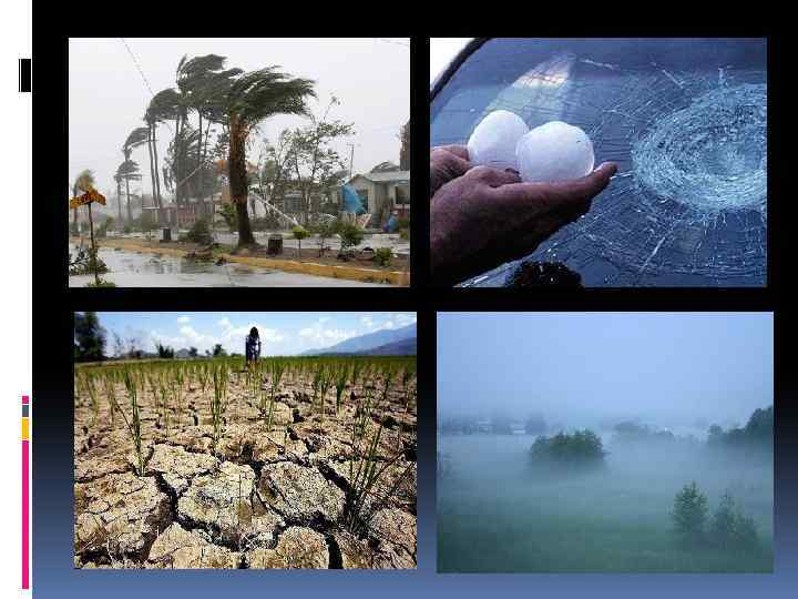 Ø метеорологического характера (бури, ураганы, смерчи, торнадо, шквалы, крупный град, ливни, сильные снегопады, морозы, метели, туманы, сильный гололед, сильная жара, заморозки, засухи);