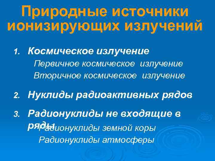Природные источники ионизирующих излучений 1. Космическое излучение Первичное космическое излучение Вторичное космическое излучение 2. Нуклиды радиоактивных рядов 3. Радионуклиды не входящие в ряды Радионуклиды земной коры Радионуклиды атмосферы