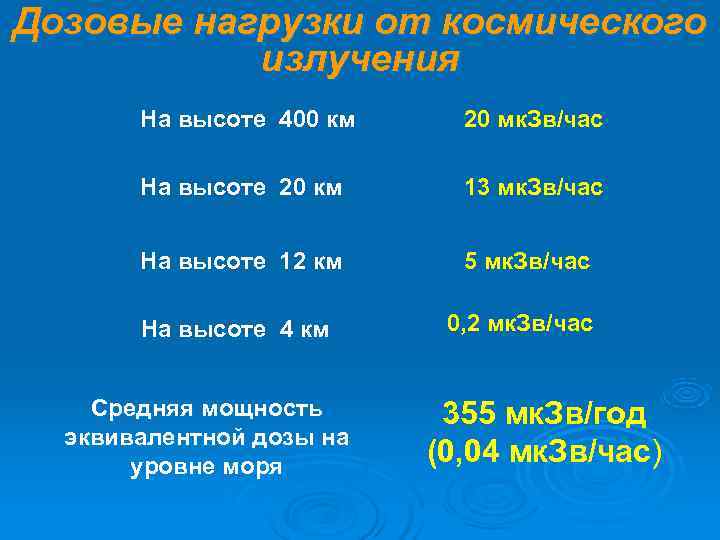 Дозовые нагрузки от космического излучения На высоте 400 км 20 мк. Зв/час На высоте 20 км 13 мк. Зв/час На высоте 12 км 5 мк. Зв/час На высоте 4 км 0, 2 мк. Зв/час Средняя мощность 355 мк. Зв/год эквивалентной дозы на уровне моря (0, 04 мк. Зв/час)