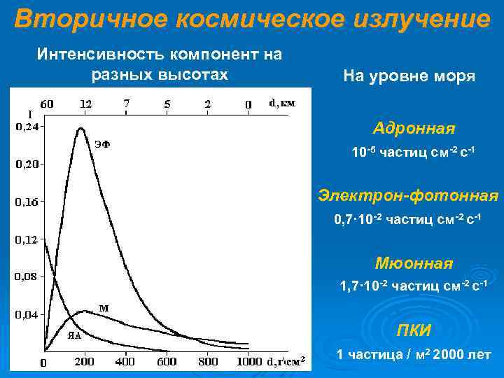 Вторичное космическое излучение Интенсивность компонент на разных высотах На уровне моря Адронная 10 -5 частиц см-2 с-1 Электрон-фотонная 0, 7· 10 -2 частиц см-2 с-1 Мюонная 1, 7· 10 -2 частиц см-2 с-1 ПКИ 1 частица / м 2 2000 лет