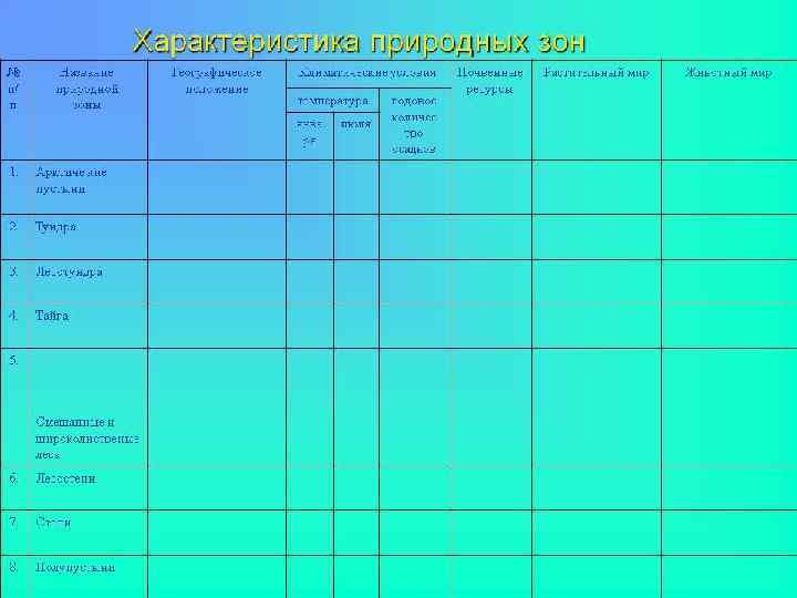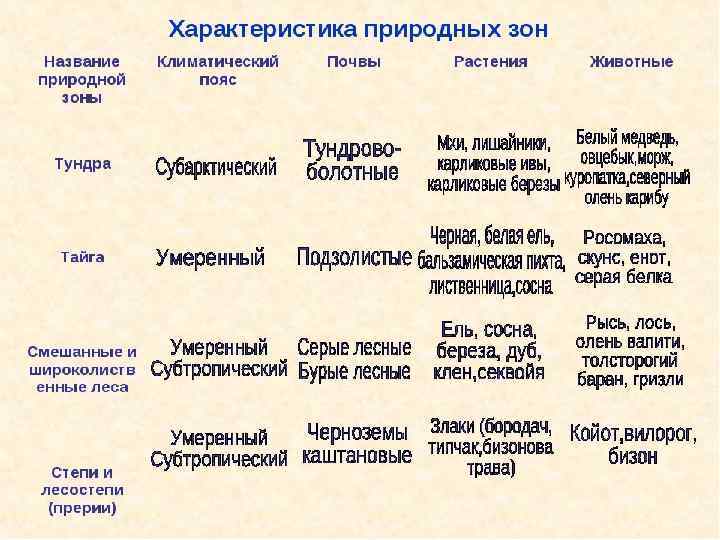 Характеристики природных зон Евразии Природные зоны Клм. пояса Флора (4 вида) Фауна (4 вида) почвы Арктическая пустыя Арктика Мхи, лишайники, полярный мак. Белый медведь, лемминг, писец, северный олень. Многолетняя мерзлота Тундра Лесотундра Тайга Смеш. широколи ственные леса Степи Пустыни