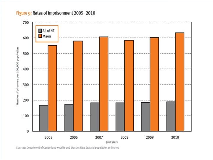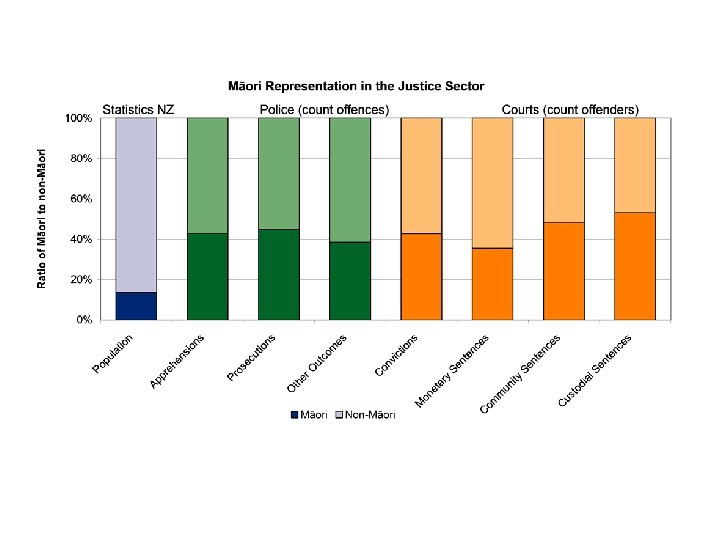 Ministry of Justice Report 2007 • Mäori aged 10 to 13 six times more likely to be apprehended than their New Zealand European counterparts. • Mäori aged 17 to 20 are three times more likely to be so. • Mäori women are 5 ½ times more likely to be apprehended and ten times more likely to receive a custodial sentence • Mäori men are over four times more likely to be apprehended and seven times more likely to receive a custodial sentence