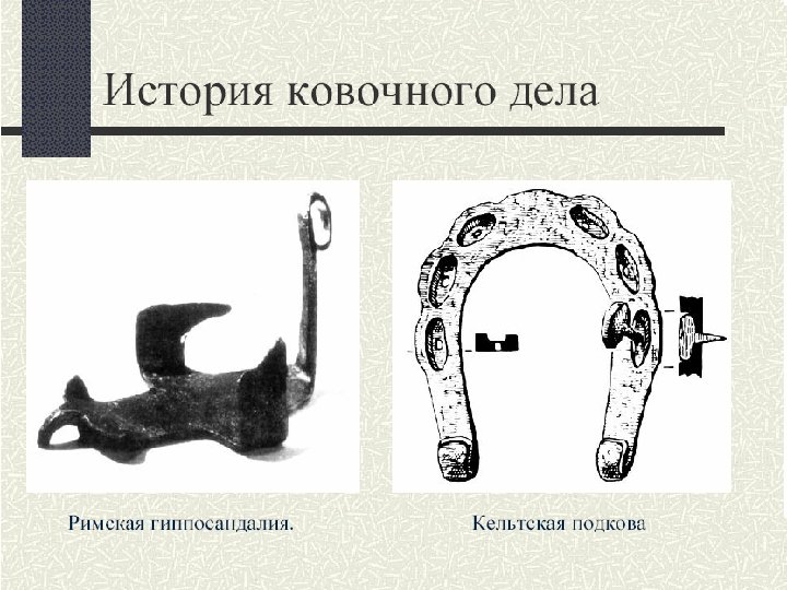 Краткая история подковывания: • Первыми подковы стали применять кельты. • Ассирийцы (около 2000 лет до н. э. ) применяли для защиты копыта металлические пластинки, которые укрепляли с помощью веревки. • В Древнем Египте защитой копыт занимались с XII в. до н. э. • В I в. до н. э. подковывание получило распространение в римской империи. Для этого использовались плетенные из лыка, тростника, кожи, растительных волокон чулки или башмаки, которые фиксировались с помощью веревок или ремней над венчиком копыта. • В XII в. подковывание стали применять повсеместно.
