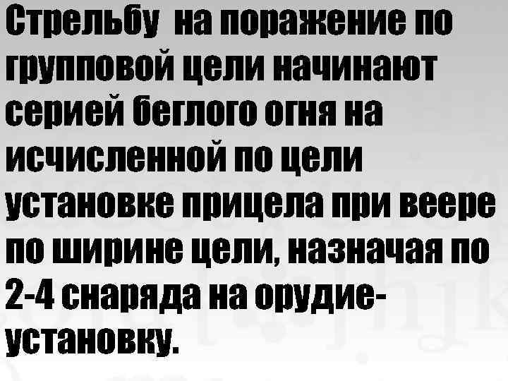 Стрельбу на поражение по групповой цели начинают серией беглого огня на исчисленной по цели установке прицела при веере по ширине цели, назначая по 2 -4 снаряда на орудиеустановку.