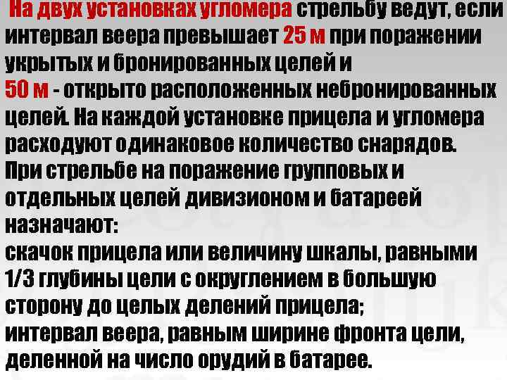 На двух установках угломера стрельбу ведут, если интервал веера превышает 25 м при поражении укрытых и бронированных целей и 50 м - открыто расположенных небронированных целей. На каждой установке прицела и угломера расходуют одинаковое количество снарядов. При стрельбе на поражение групповых и отдельных целей дивизионом и батареей назначают: скачок прицела или величину шкалы, равными 1/3 глубины цели с округлением в большую сторону до целых делений прицела; интервал веера, равным ширине фронта цели, деленной на число орудий в батарее.