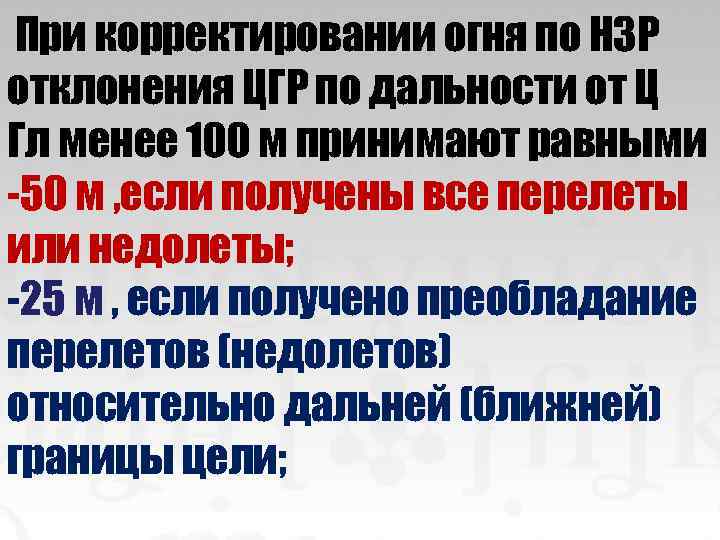 При корректировании огня по НЗР отклонения ЦГР по дальности от Ц Гл менее 100 м принимают равными -50 м , если получены все перелеты или недолеты; -25 м , если получено преобладание перелетов (недолетов) относительно дальней (ближней) границы цели;