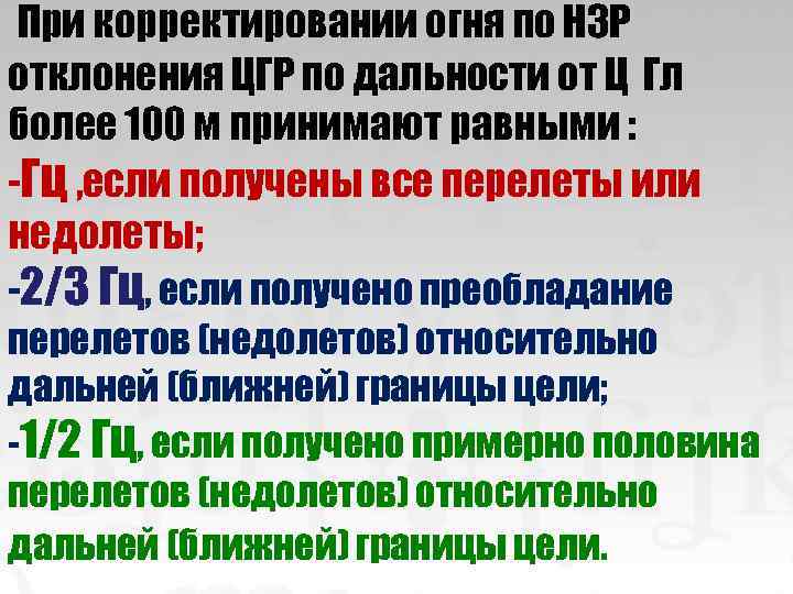 При корректировании огня по НЗР отклонения ЦГР по дальности от Ц Гл более 100 м принимают равными : -Гц , если получены все перелеты или недолеты; -2/3 Гц, если получено преобладание перелетов (недолетов) относительно дальней (ближней) границы цели; -1/2 Гц, если получено примерно половина перелетов (недолетов) относительно дальней (ближней) границы цели.