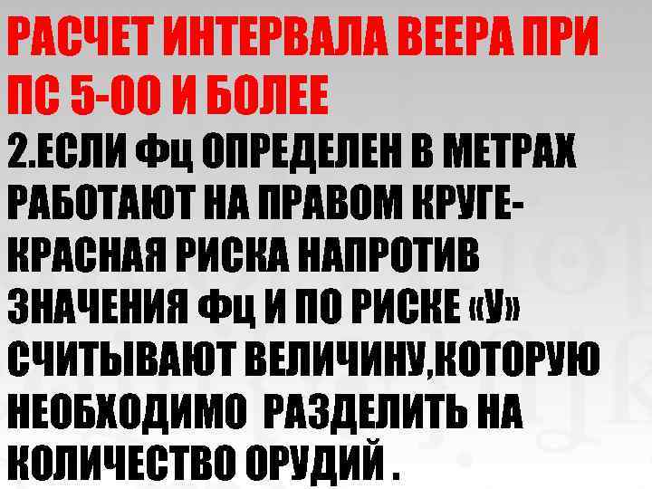 РАСЧЕТ ИНТЕРВАЛА ВЕЕРА ПРИ ПС 5 -00 И БОЛЕЕ 1. ЕСЛИ Фц ОПРЕДЕЛЕН В Д. У РАБОТАЮТ НА ЛЕВОМ КРУГЕКРАСНАЯ РИСКА НАПРОТИВ ЗНАЧЕНИЯ Фц И ПО РИСКЕ «У» СЧИТЫВАЮТ ВЕЛИЧИНУ, КОТОРУЮ НЕОБХОДИМО РАЗДЕЛИТЬ НА КОЛИЧЕСТВО ОРУДИЙ.