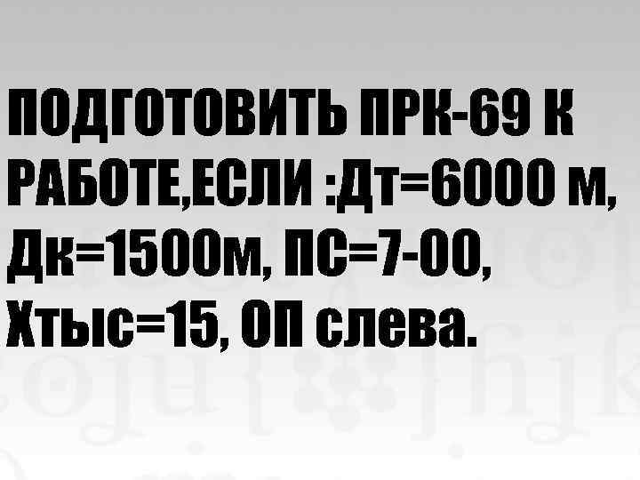 ПОДГОТОВИТЬ ПРК-69 К РАБОТЕ, ЕСЛИ : Дт=6000 м, Дк=1500 м, ПС=7 -00, Хтыс=15, ОП слева.