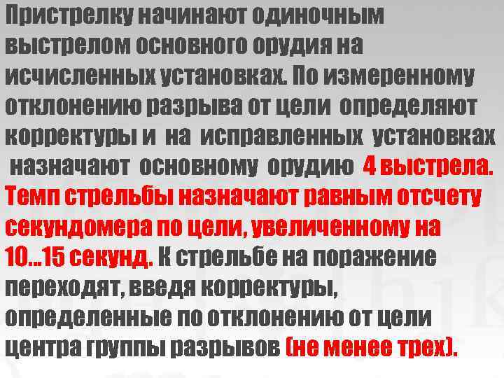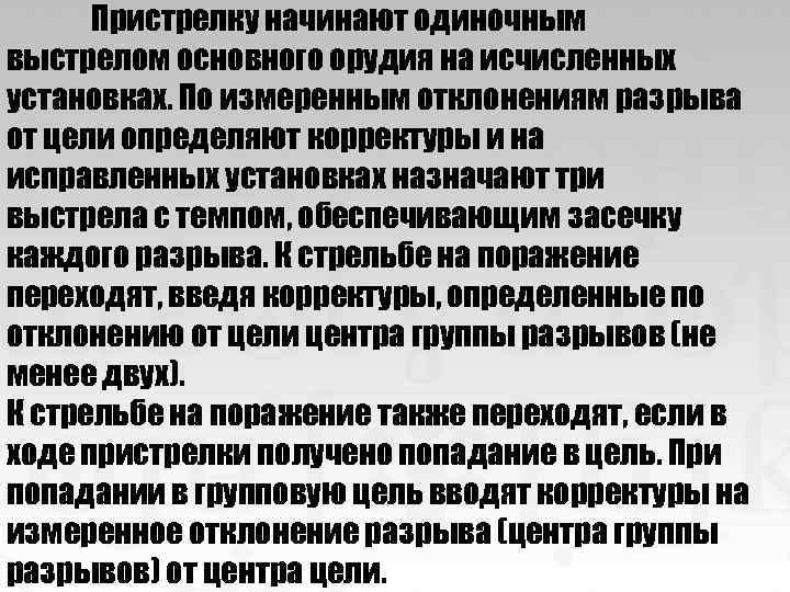 Пристрелку начинают одиночным выстрелом основного орудия на исчисленных установках. По измеренным отклонениям разрыва от цели определяют корректуры и на исправленных установках назначают три выстрела с темпом, обеспечивающим засечку каждого разрыва. К стрельбе на поражение переходят, введя корректуры, определенные по отклонению от цели центра группы разрывов (не менее двух). К стрельбе на поражение также переходят, если в ходе пристрелки получено попадание в цель. При попадании в групповую цель вводят корректуры на измеренное отклонение разрыва (центра группы разрывов) от центра цели.