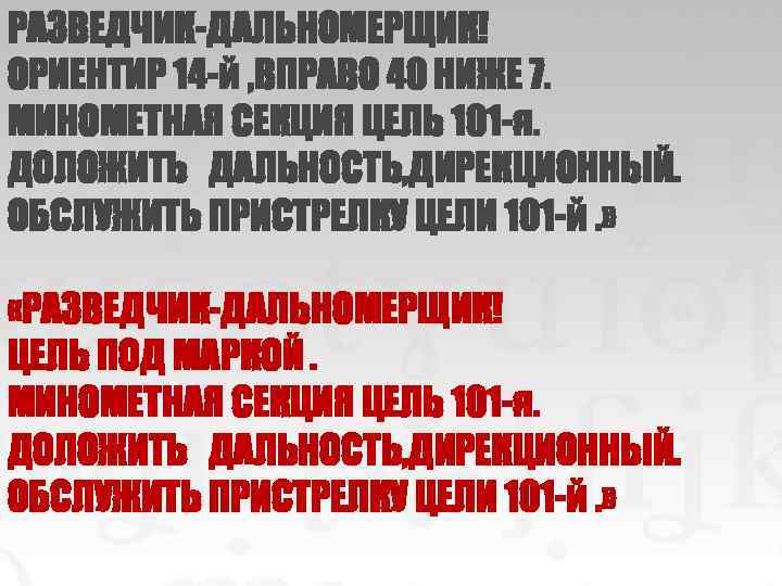 РАЗВЕДЧИК-ДАЛЬНОМЕРЩИК! ОРИЕНТИР 14 -й , ВПРАВО 40 НИЖЕ 7. МИНОМЕТНАЯ СЕКЦИЯ ЦЕЛЬ 101 -я. ДОЛОЖИТЬ ДАЛЬНОСТЬ, ДИРЕКЦИОННЫЙ. ОБСЛУЖИТЬ ПРИСТРЕЛКУ ЦЕЛИ 101 -й. » «РАЗВЕДЧИК-ДАЛЬНОМЕРЩИК! ЦЕЛЬ ПОД МАРКОЙ. МИНОМЕТНАЯ СЕКЦИЯ ЦЕЛЬ 101 -я. ДОЛОЖИТЬ ДАЛЬНОСТЬ, ДИРЕКЦИОННЫЙ. ОБСЛУЖИТЬ ПРИСТРЕЛКУ ЦЕЛИ 101 -й. »