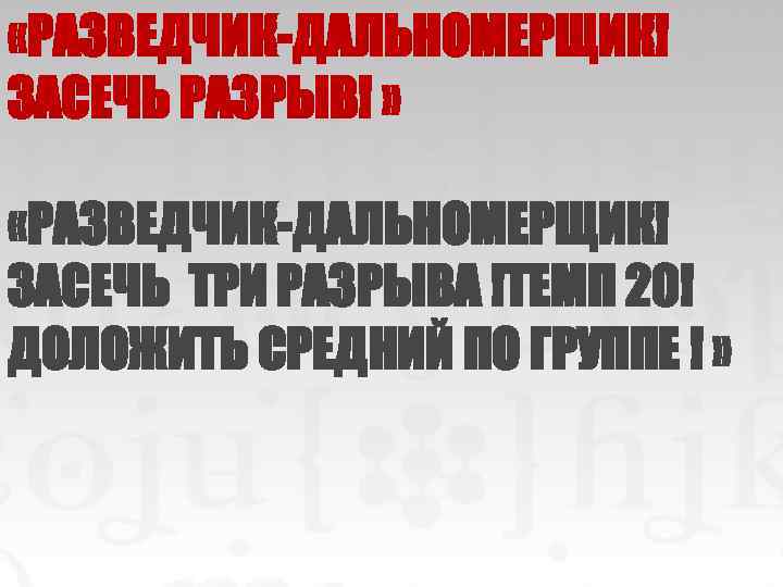 «РАЗВЕДЧИК-ДАЛЬНОМЕРЩИК! ЗАСЕЧЬ РАЗРЫВ! » «РАЗВЕДЧИК-ДАЛЬНОМЕРЩИК! ЗАСЕЧЬ ТРИ РАЗРЫВА !ТЕМП 20! ДОЛОЖИТЬ СРЕДНИЙ ПО ГРУППЕ ! »