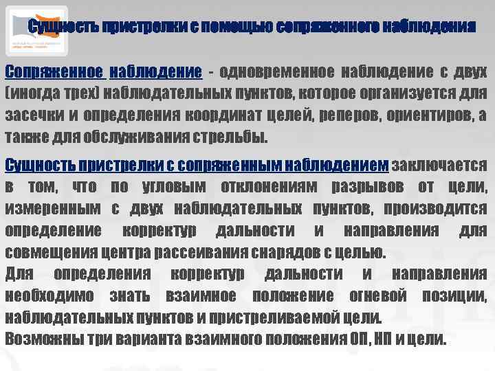 Сущность пристрелки с помощью сопряженного наблюдения Сопряженное наблюдение - одновременное наблюдение с двух (иногда трех) наблюдательных пунктов, которое организуется для засечки и определения координат целей, реперов, ориентиров, а также для обслуживания стрельбы. Сущность пристрелки с сопряженным наблюдением заключается в том, что по угловым отклонениям разрывов от цели, измеренным с двух наблюдательных пунктов, производится определение корректур дальности и направления для совмещения центра рассеивания снарядов с целью. Для определения корректур дальности и направления необходимо знать взаимное положение огневой позиции, наблюдательных пунктов и пристреливаемой цели. Возможны три варианта взаимного положения ОП, НП и цели.