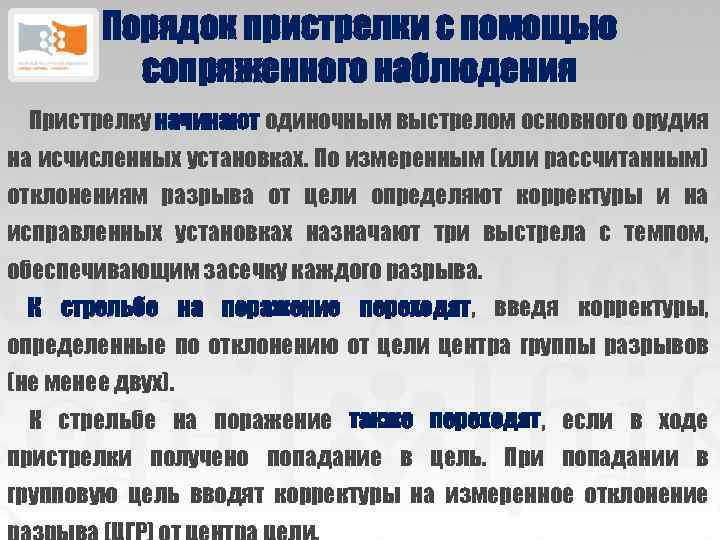 Порядок пристрелки с помощью сопряженного наблюдения Пристрелку начинают одиночным выстрелом основного орудия на исчисленных установках. По измеренным (или рассчитанным) отклонениям разрыва от цели определяют корректуры и на исправленных установках назначают три выстрела с темпом, обеспечивающим засечку каждого разрыва. К стрельбе на поражение переходят, введя корректуры, определенные по отклонению от цели центра группы разрывов (не менее двух). К стрельбе на поражение также переходят, если в ходе пристрелки получено попадание в цель. При попадании в групповую цель вводят корректуры на измеренное отклонение